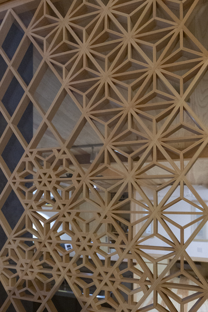 細く均一に削り出された木片が、わずかな狂いもなく組み合わされ、連続する幾何学模様を描いています。