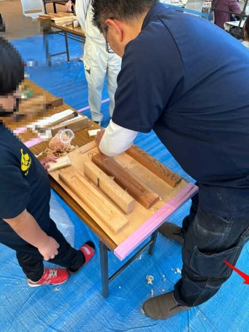 大工さんに手伝ってもらいながら皆さん一生懸命に慣れないカンナを持って削っておりました。