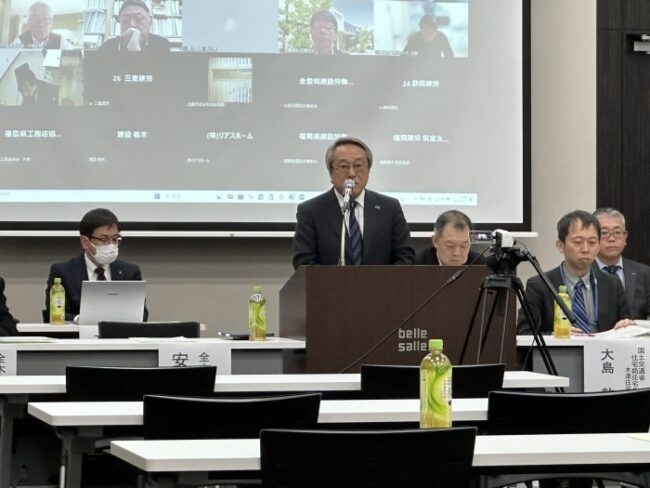 冒頭、安成理事長の挨拶、その後来賓として国土交通省より大島木造住宅振興室長よりご挨拶いただきました。