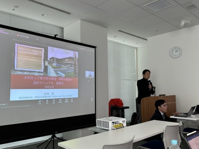 防耐火の一通りの話と木材を耐火被覆に使うにあたりその特性を丁寧に説明していただいた後、今回の認定仕様の解説をしていただきました。