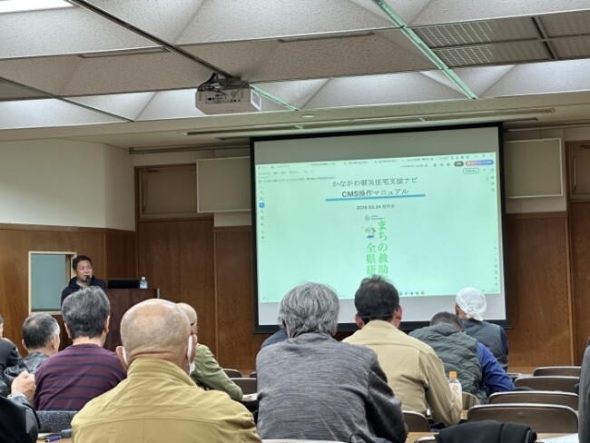 神奈川県と災害時住宅相談の協定に基づく勉強として被災住宅応急修理体制の概要と、国の補助事業で作成した応急修理の管理アプリ「かながわ被災住宅支援ナビ」の説明、まちの救助隊方針提起を行いました。
