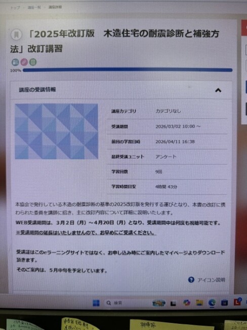 書籍も販売が遅れていたので日本建築防災協会のサイトでEラーニングで受講し、書籍もゲットしておりました。